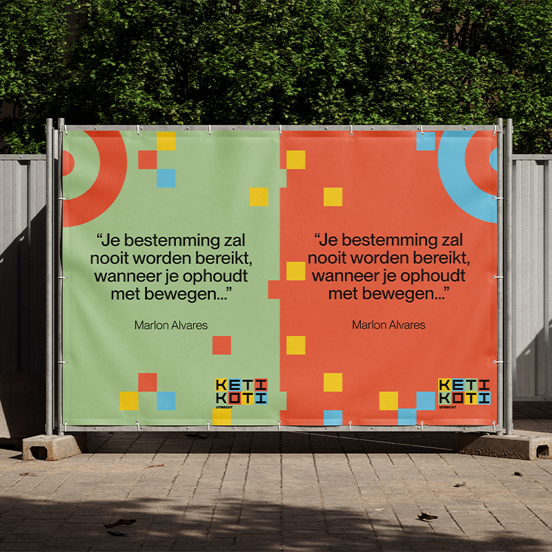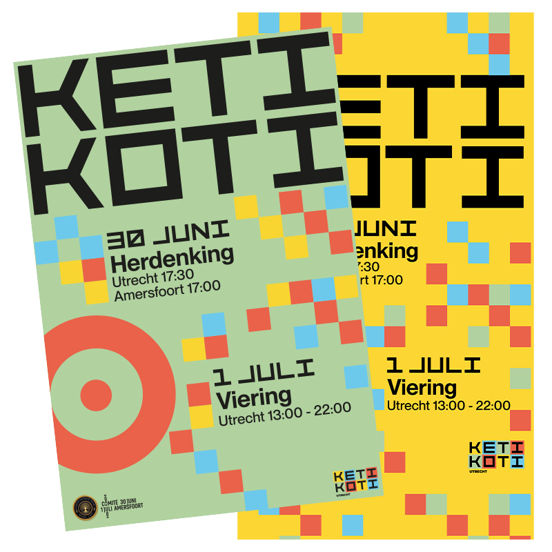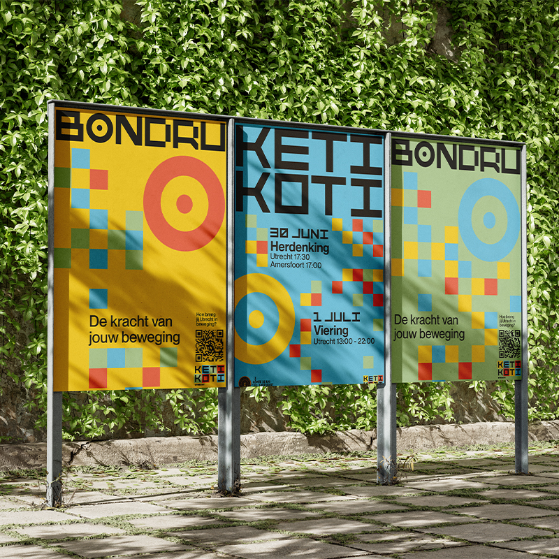 The 2024 and 2025 campaign for the promotion of Keti Koti Utrecht. Inspired by the pangi madras pattern widely known for its connection to Surinamese culture. This pattern was used fiercely in several headwraps which in turn is a way of communication. This pattern was translated in the graphic design by using the squares as a design element.